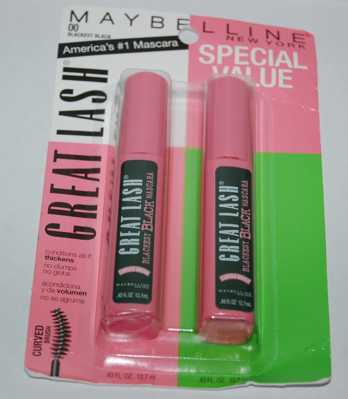 MAYBELLINE GREAT LASH MASCARA CURVED BRUSH 2 PACK COLOR BLACKEST BLACK 00