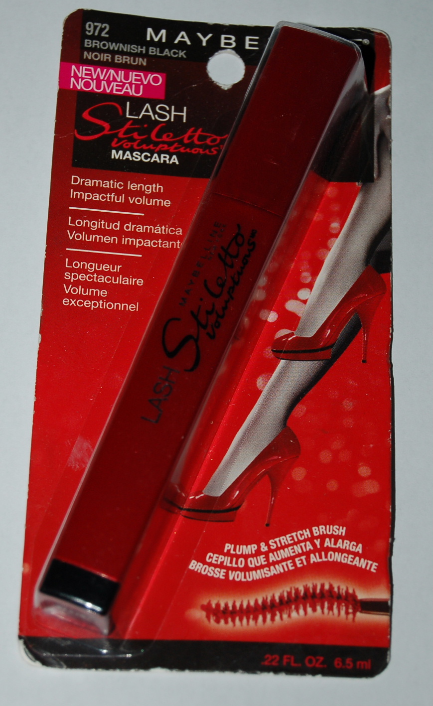NEW Carded Maybelline Lash Stilletto Voluptuous Mascara. The unique s-shaped brush stretches as it thickens, reaching every lash with the rich cream formula for dramatic length & impactful volume. Sweep Plump and Stretch brush upwards from root to tip to grasp each lash and coat from every angle. Continue building lashes until you reach your desired look. Do not let dry between coats. Repeat for lower lash line. For a truly dramatic, wide-eyed look, curl your lashes with Maybelline® New York eyelash curler before applying mascara. Removes easily with soap and water or Maybelline® New York Expert Eyes® 100% Oil-Free Eye Makeup Remover. Contact lens safe and Ophthalmologist tested