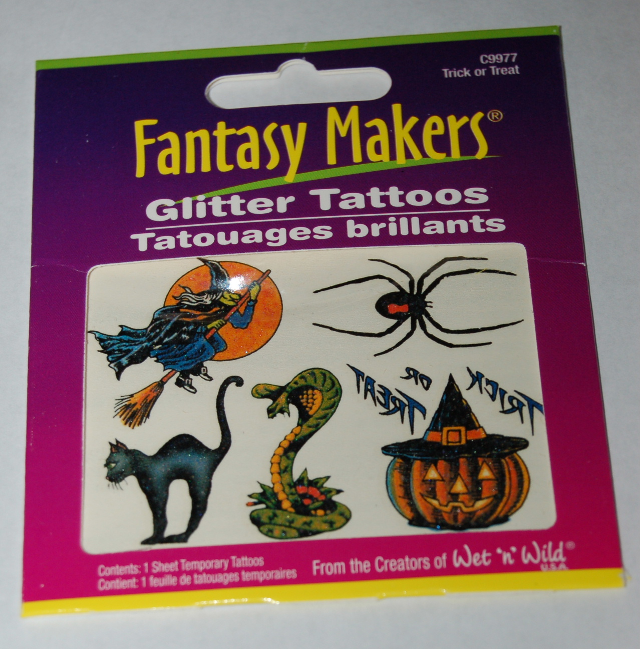 NEW From the creators of Wet n' Wild. Fantasy Makers Halloween Large Glitter Temporary Tattoos (5 Large Tattoos per sheet). 1 sheet with Temporary Halloween Tattoos. These tattoos have spiders, cats, witches, pumpkins, and snakes!